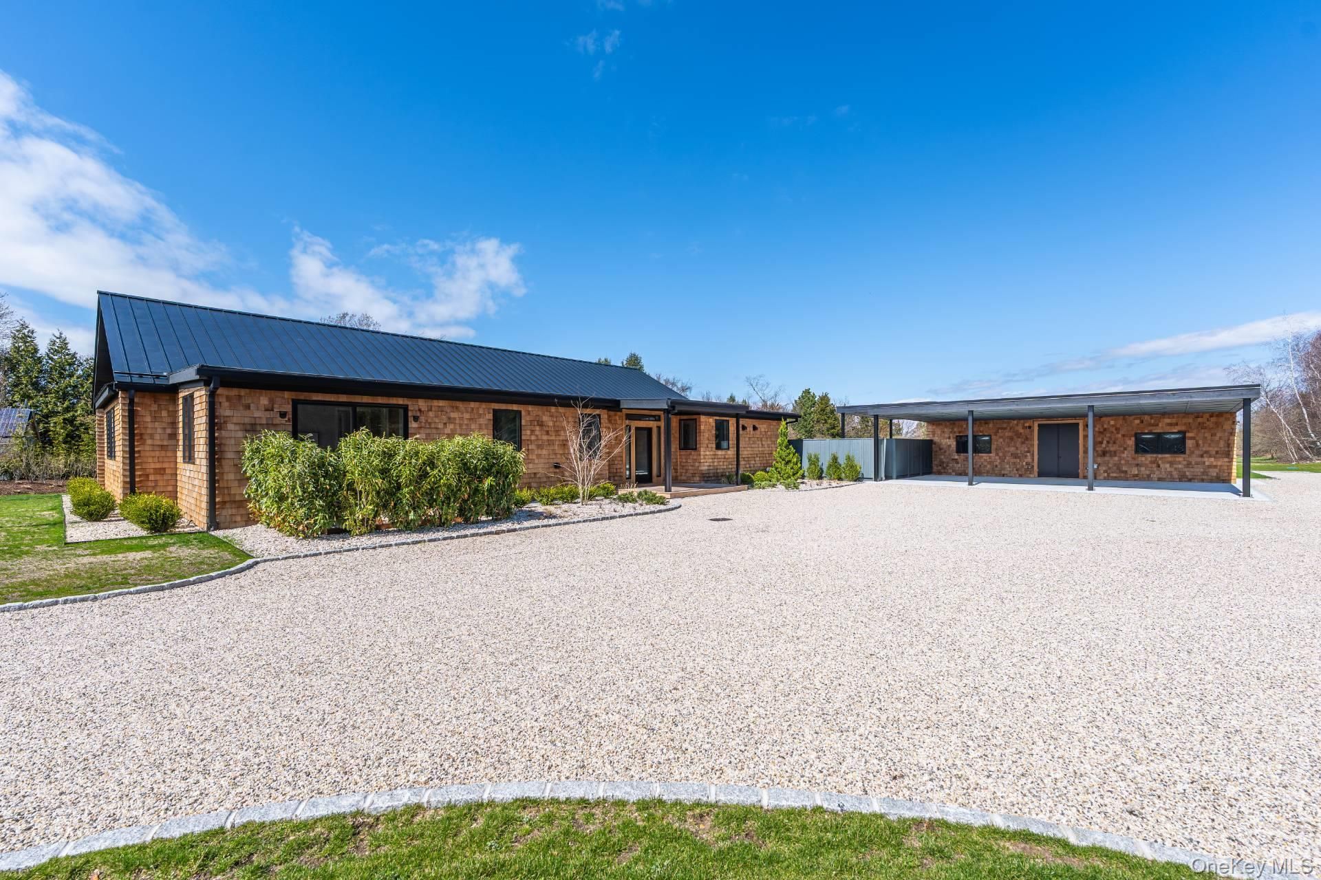 CHIC, SLEEK AND COMPLETELY UNIQUE - This industrial chic modern ranch hits every box. Open concept living, radiant heated concrete floors throughout. A floating fireplace and walls of glass bringing the outdoors straight into the everyday. The living space spills out to the private heated Gunite saltwater pool, expansive patio and outdoor shower - creating an indoor-outdoor flow that feels polished, relaxed, and spa-like. A covered patio provides space for al-fresco dining. With 4 bedrooms, 4.5 baths, a dedicated laundry room, and parking for 5 cars between the garage and carport, this property delivers an elevated design, completely unique to the North Fork on every level. Stroll to restaurants, farm stands, and into town. Easy in and out to NYC and surrounded by beaches and renowned vineyards!