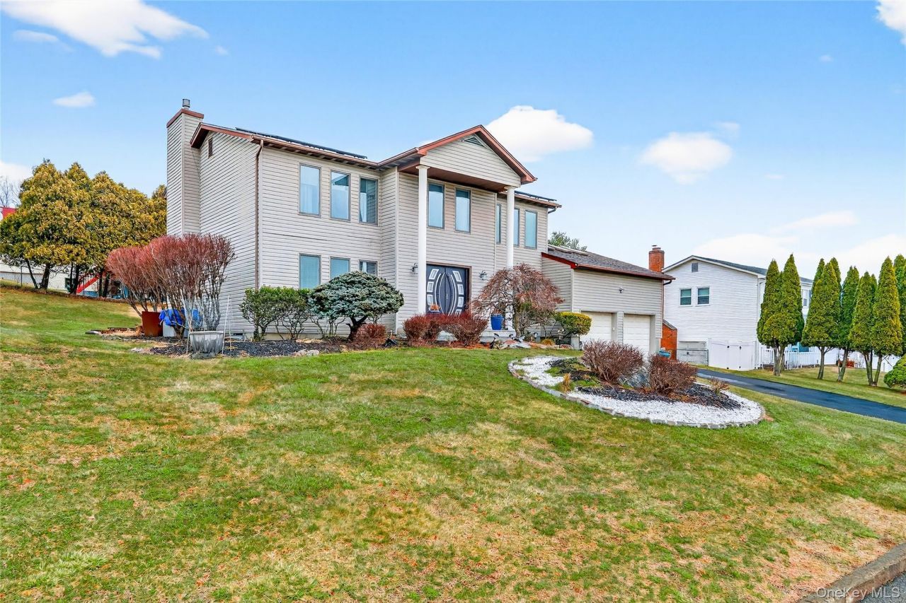 Meticulously maintained center hall Colonial, ideally situated on a quiet cul-de-sac and offering fabulous mountain views. This elegant home welcomes you with an inviting two-level entry foyer highlighted by a skylight and abundant natural light.The residence features five generously sized bedrooms and three full baths, including a convenient first floor guest bedroom and laundry. The spacious living room is filled with light and anchored by a marble gas fireplace, creating a warm and inviting atmosphere.The modern eat in kitchen offers a cozy dinette and opens through double doors to a covered stone paver patio, overlooking a beautifully maintained backyard perfect for relaxing or entertaining. Just a few steps up, a versatile loft with three skylights provides the ideal space for a home office, playroom, or family room.The second floor includes four large bedrooms, highlighted by a stunning primary suite with cathedral ceilings and a spa like en-suite bath featuring a soaking tub and separate shower.Adding exceptional value is over 1,200 square feet of finished basement space (not included in the stated square footage), ideal for recreation or storage.Additional highlights include hardwood floors throughout, central vacuum, in-ground sprinkler system, and a two car garage.Come experience the comfort, space, and lifestyle this fabulous home offers and make it your next home.